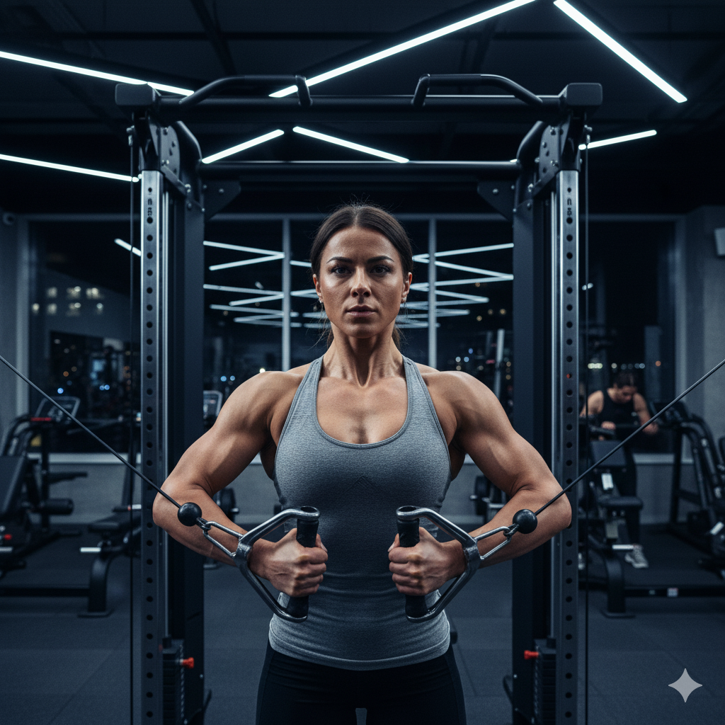 - **준비 자세:** 케이블 도르래를 어깨 높이에 설정하고, 핸들을 잡은 채 상체를 살짝 숙여 섭니다.