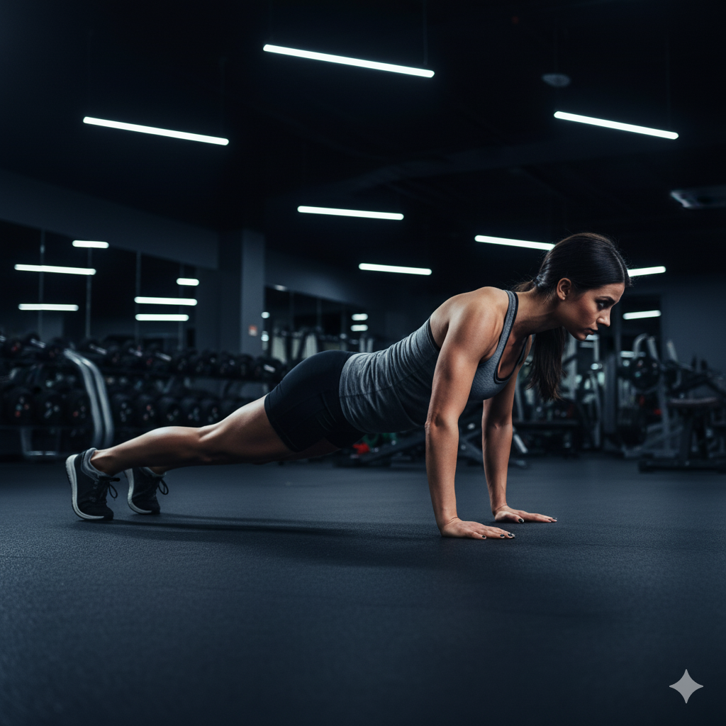 - **수축 (내리기):** 가슴이 바닥에 닿기 직전까지 천천히 몸을 내립니다. 팔꿈치는 몸통에서 약 45도 정도 벌려줍니다.