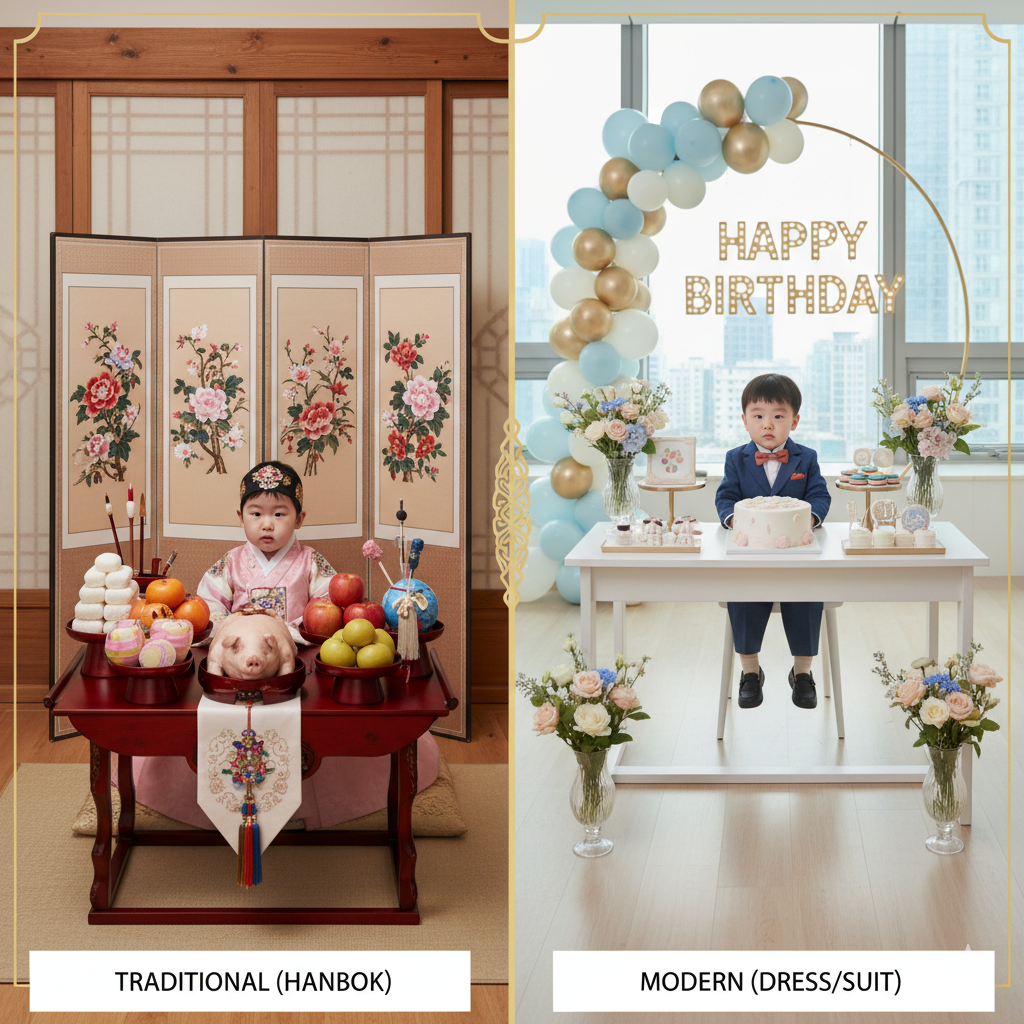 - 전통 돌상 (한복) vs. 현대식 돌상 (드레스/수트) 중 원하는 분위기를 정하고, 그에 맞는 돌상 스타일 (기본/프리미엄) 옵션을 확정합니다.