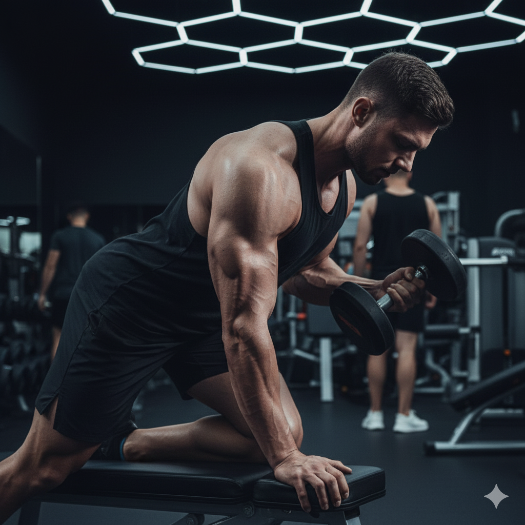 - **준비 자세:** 벤치 위에 한쪽 무릎과 같은 쪽 손을 대고, 다른 쪽 손으로 덤벨을 잡습니다. 허리가 구부러지지 않도록 수평을 유지하고 코어에 힘을 줍니다.
