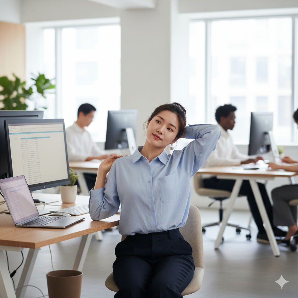 | **출근 후 (9:00)** | 목/어깨 스트레칭 | 긴장 완화, 거북목 예방 |