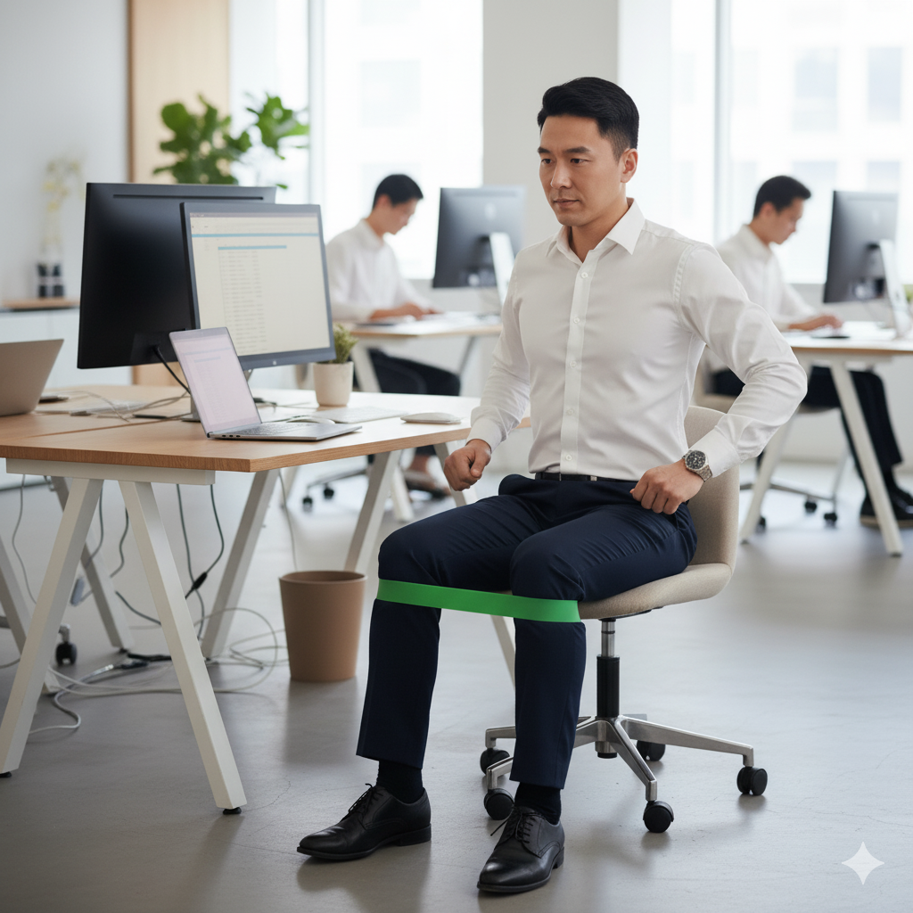 작은 미니 밴드(힙 밴드)는 사무실에서 티 안 나게 하체 근육을 강화할 수 있는 최고의 도구입니다. 퇴근 후 힙업 효과까지 노려보세요!