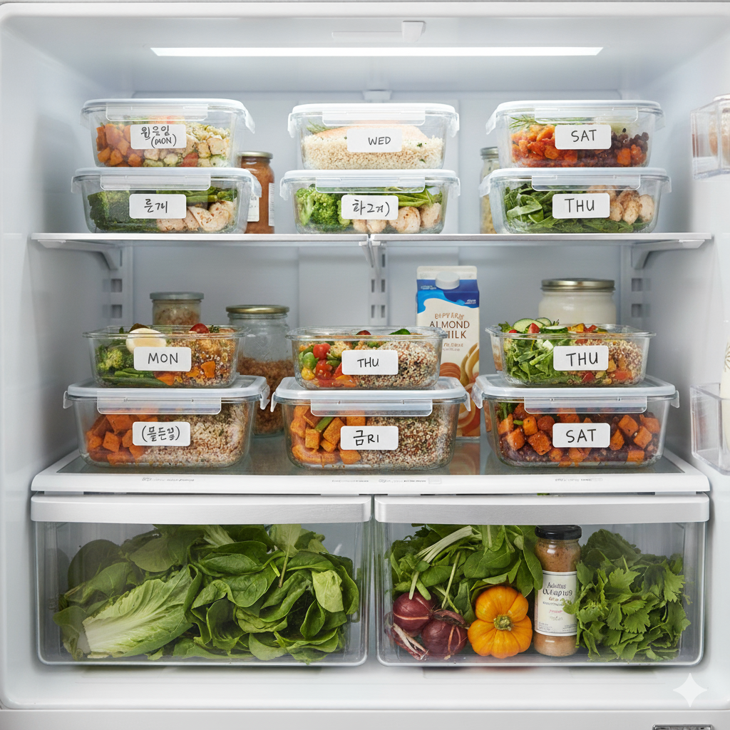 - **적정 보관 기간:** 조리된 밀프렙은 보통 냉장 3~4일이 안전합니다. 따라서 주 2회(일요일, 수요일 밤) 준비하는 것이 가장 이상적입니다.