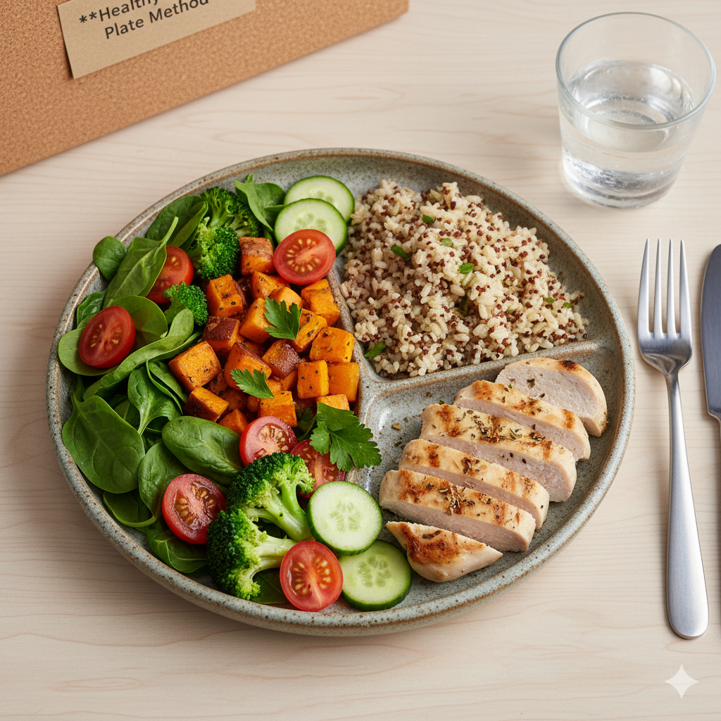 적당한 접시의 **1/2은 채소**, 나머지 절반 중 **1/4은 저지방 단백질**, 나머지 **1/4은 통곡물 탄수화물**로 채우는 플레이트 구성을 기억하세요. (출처: 필라이즈, Cochrane 연구 참고)